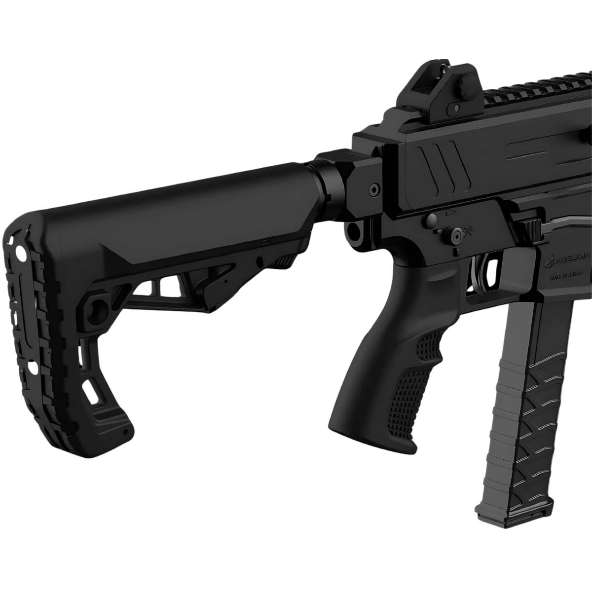 - Teleskopowa, odłączana kolba montowana na szynie Picatinny – regulowana i składana dla maksymalnej funkcjonalności.